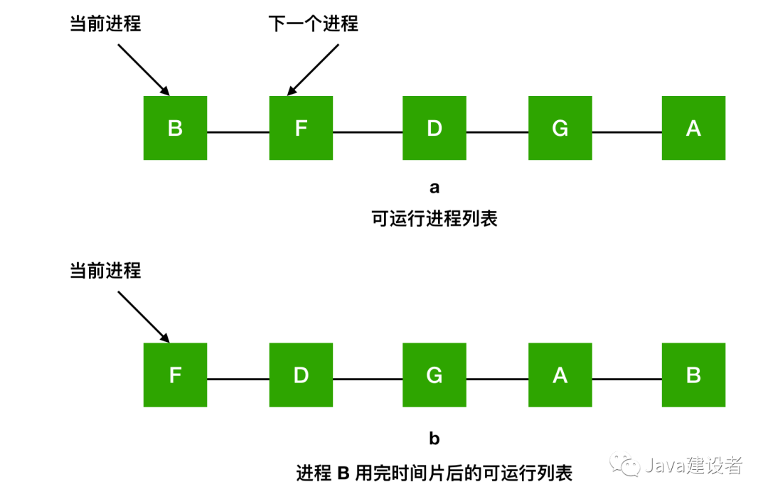 ,在这个时间片内允许进程运行。如果时间片结束时进程还在运行的话,则抢占一个 CPU 并将其分配给另一个进程。如果进程在时间片结束前阻塞或结束,则 CPU 立即进行切换。轮询算法比较容易实现。调度程序所做的就是维护一个可运行进程的列表,就像下图中的 a,当一个进程用完时间片后就被移到队列的末尾,就像下图的 b。