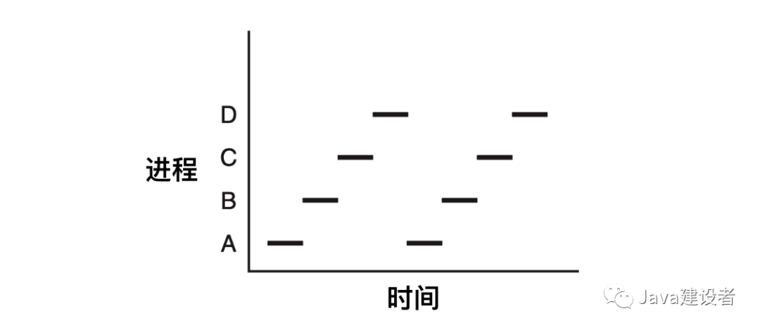 从下图我们可以看到,在观察足够长的一段时间后,所有的进程都运行了,但在任何一个给定的瞬间仅有一个进程真正运行。