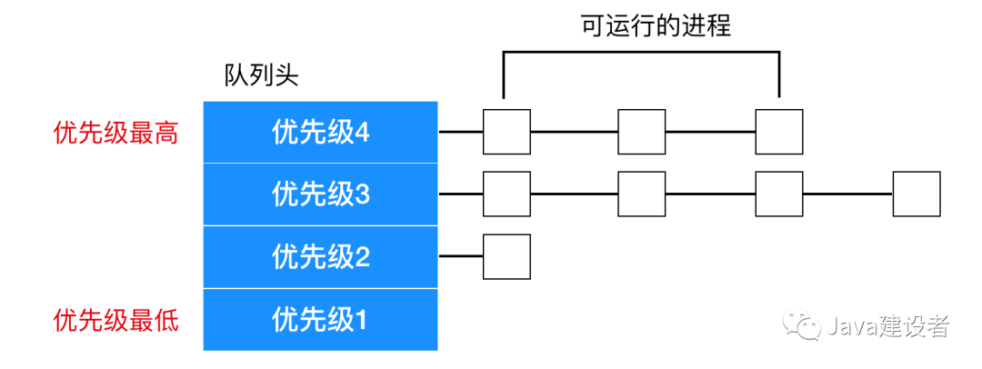 它的调度算法主要描述如下:上面存在优先级为 4 类的可运行进程,首先会按照轮转法为每个进程运行一个时间片,此时不理会较低优先级的进程。若第 4 类进程为空,则按照轮询的方式运行第三类进程。若第 4 类和第 3 类进程都为空,则按照轮转法运行第 2 类进程。如果不对优先级进行调整,则低优先级的进程很容易产生饥饿现象。