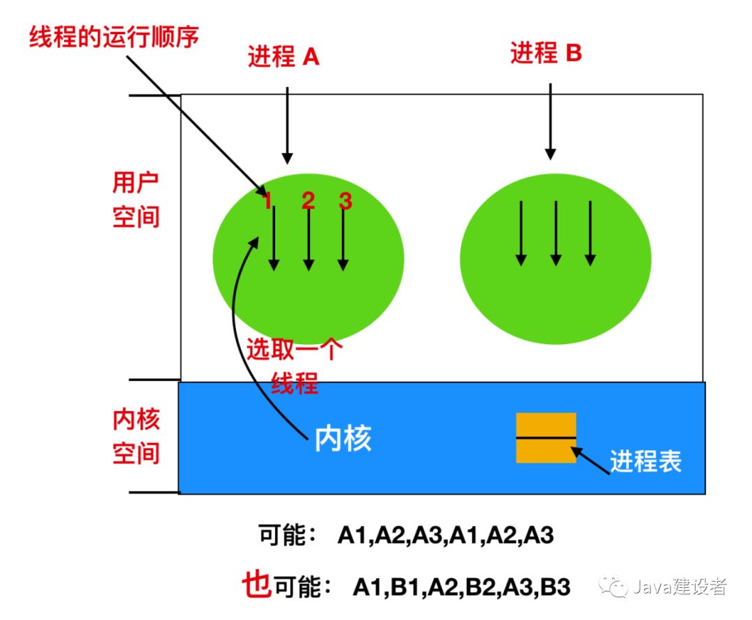现在考虑使用内核线程的情况,内核选择一个特定的线程运行。它不用考虑线程属于哪个进程,不过如果有必要的话,也可以这么做。对被选择的线程赋予一个时间片,而且如果超过了时间片,就会强制挂起该线程。一个线程在 50 ms 的时间片内,5 ms 之后被阻塞,在 30 ms 的时间片中,线程的顺序会是 A1,B1,A2,B2,A3,B3。如下图所示