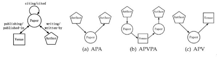 如图 2 所示,连接两个 author 可以有不同的元路径。例如:author->paper->author,描述的是两个作者之间的合作关系;还可以有 author->paper->venue->paper->author,这条元路径描述的是两个作者参加同一个会议这么一个关系。