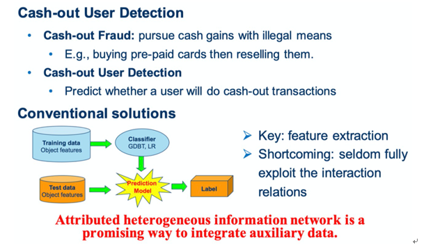 套现是套取现金的简称,一般是指用违法或虚假的手段交换取得现金利益。如图8所示,判断一个用户是不是套现用户,传统方法是把套现用户检测看成一个分类问题,通过抽取出用户特征,然后用分类器来进行分类。这个过程的一个关键问题是怎么才能够抽取出足够丰富的特征。而在电商特别是互联网金融方面,用户特征大量蕴含在交互行为里面,那么怎么从这种交互行为里面抽取出用户特征,是这个问题的关键。