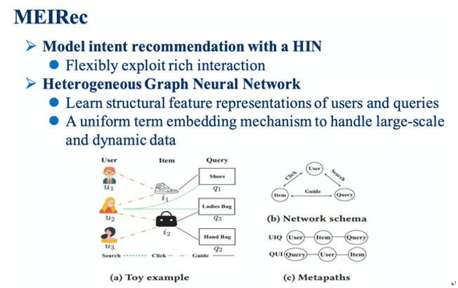 可以设计一个异质网络来解决这个问题 [11]。如图 9 所示,网络中刻划了用户、物品和查询词三者之间的交互关系,模型来学习 user、item、query 之间的表示,然后看看针对一个用户来推荐什么样的 query。我们同样是基于元路径来聚合邻居信息,在这个过程中可以利用不同的元路径来聚合不同的邻居信息。实际问题当中,user、item、query 的量级是相当大的,在亿级的规模。但是用于组成它们的 word 的数量实际上是不大的,大概是十万级别的。那么仅仅学习 word 的特征表示,然后 query 和 item 的特征由一些 word 拼接而成的,这样就减少了计算量。通过和工业界的算法对比,提出的方法利用增加的元路径信息得到了性能的稳步提升。